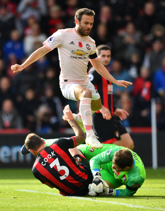 Soccer Football - Premier League - AFC Bournemouth v Manchester United - Vitality Stadium, Bournemouth, Britain - November 3, 2018 Manchester United's Juan Mata in action with Bournemouth's Steve Cook and Asmir Begovic REUTERS/Dylan Martinez EDITORIAL USE ONLY. No use with unauthorized audio, video, data, fixture lists, club/league logos or "live" services. Online in-match use limited to 75 images, no video emulation. No use in betting, games or single club/league/player publications. Please contact your account representative for further details.