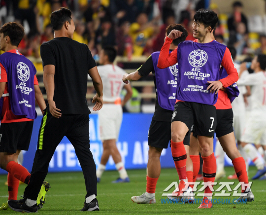 한국과 중국의 2019 AFC 아시안컵 C조 조별리그 3차전이 16일(현지시간) 아랍에미리트 아부다비 알 나얀 스타디움에서 열렸다. 한국이 2대0으로 승리하며 조1위를 확정지었다. 경기 종료 후 기쁨을 나누는 손흥민의 모습. 아부다비(아랍에미리트)=허상욱 기자 wook@sportschosun.com/2019.01.16/
