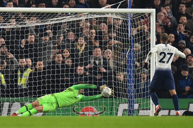토트넘이 잉글랜드 리그컵 4강에서 승부차기 끝에 첼시에 패하며 결승진출에 실패했다. 토트넘은 25일(한국시각) 런던 스탬퍼드 브리지에서 열린 첼시와의 리그컵 4강 2차전에서 1대2로 진 뒤 1, 2차전 합계 동률로 승부차기에 들어갔다. 그러나 여기서 2-4로 졌다. 승부차기 4번 주자로 나선 토트넘 루카스 모라의 킥이 첼시 키퍼 케파 아리자발라가에게 막히는 장면. AFP연합뉴스