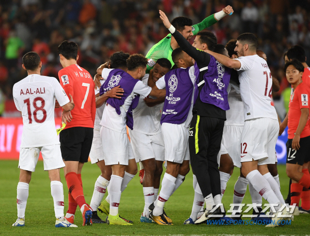 한국과 카타르의 2019 AFC 아시안컵 8강전 경기가 25일(현지시간) 아랍에미리트 아부다비 자예드 스포츠시티 스타디움에서 열렸다. 한국이 카타르에 패하며 4강진출이 좌절됐다. 기뻐하는 카타르 선수들 사이로 발걸음을 옮기는 손흥민의 모습. 아부다비(아랍에미리트)=허상욱 기자 wook@sportschosun.com/2019.01.25/