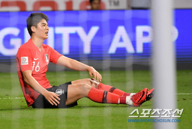한국과 필리핀의 2019 아시안컵 조별예선 1차전 경기가 7일 아랍에미리트 두바이 알막툼 스타디움에서 열렸다. 기성용이 그라운드에 주저앉아 고통을 호소하고 있다. 두바이(아랍에미리트)=허상욱 기자 wook@sportschosun.com/2019.01.07/