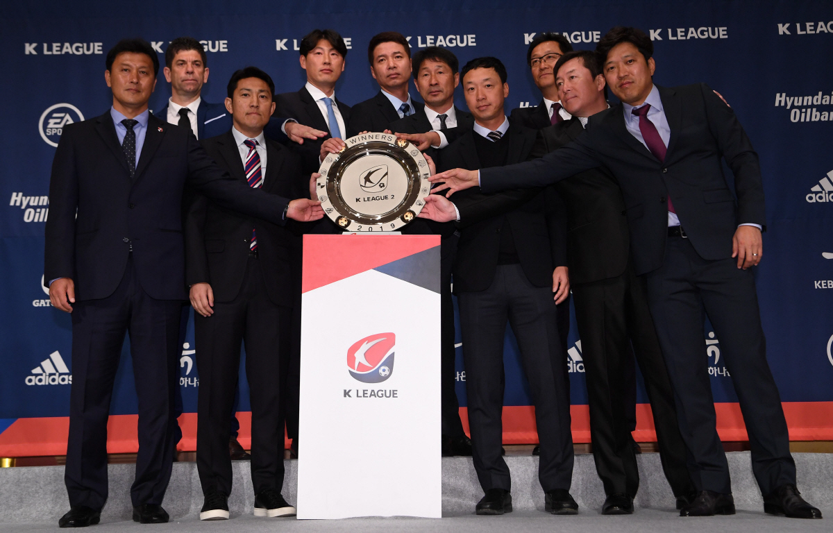 2019 K리그 개막 미디어데이가 26일 서울 홍은동 그랜드힐튼호텔에서 열렸다. K리그 2 미디어데이에 참석한 10개 구단의 감독이 포토타임을 갖고 있다. K리그2 미디어데이에는 전남 파비아노 수아레즈 감독과 한찬희, 아산 박동혁 감독과 이명주, 부산 조덕제 감독과 한지호, 대전 고종수 감독과 박주원, 광주 박진섭 감독과 김태윤, 안양 김형열 감독과 주현재, 수원 김대의 감독과 조유민, 부천 송선호 감독과 김영남, 안산 임완섭 감독과 장혁진, 서울이랜드 김현수 감독과 김영광이 참석했다. 홍은동=허상욱 기자 wook@sportschosun.com/2019.02.26/