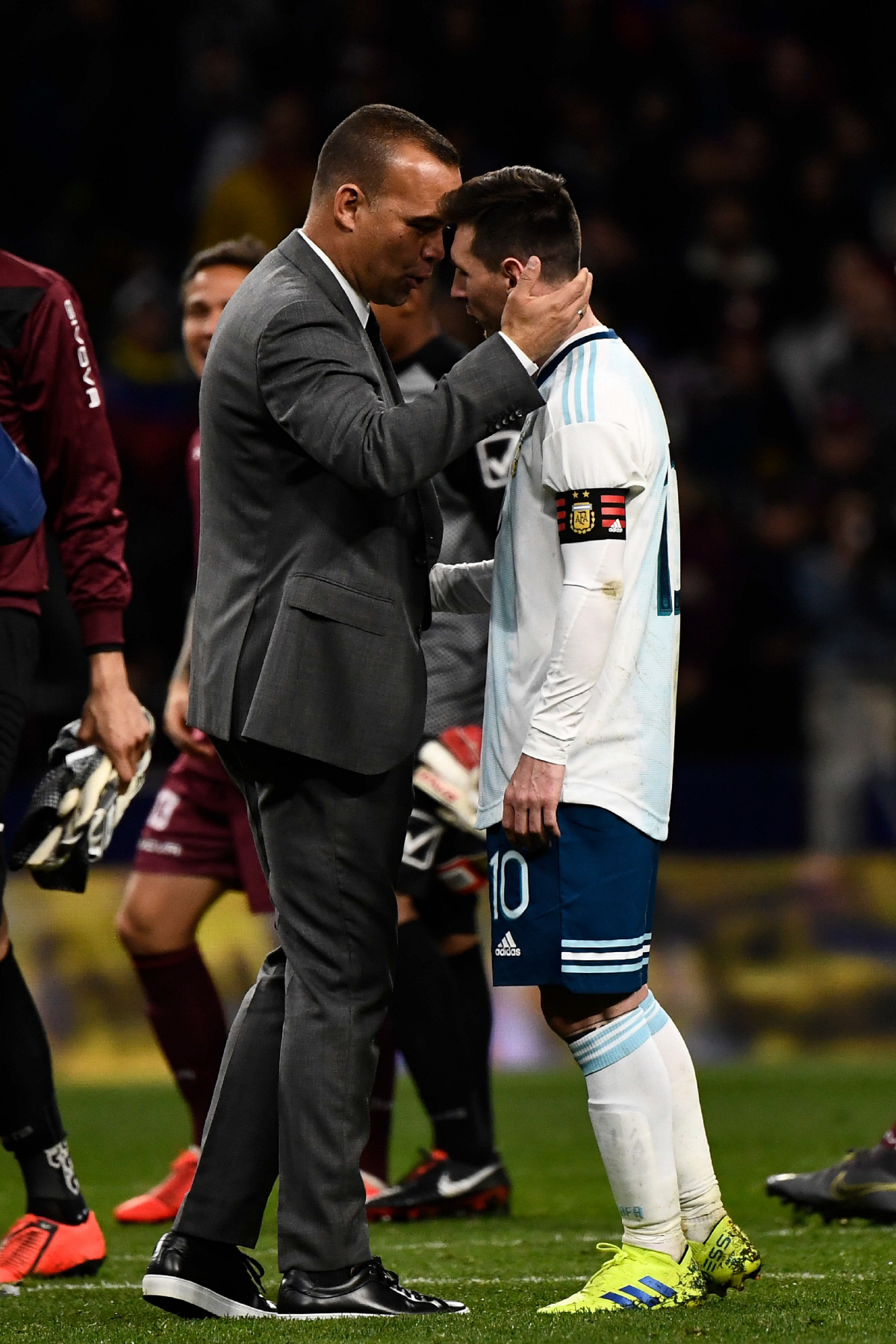 아르헨티나-베네수엘라간 친선경기를 마치고 리오넬 메시와 대화를 나누는 라파엘 두다멜 감독. AFP연합뉴스
