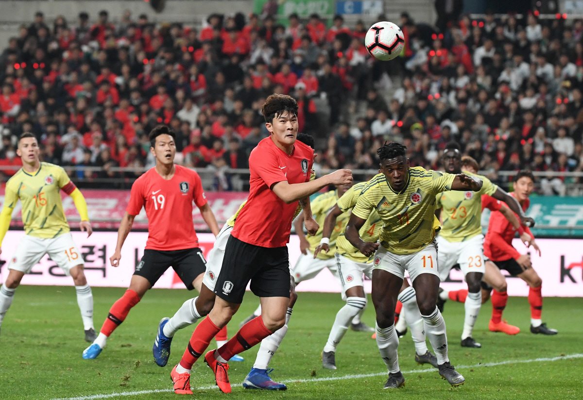 벤투 감독이 이끄는 축구국가대표팀이 26일 오후 8시 서울 상암동 서울월드컵경기장에서 콜롬비아와 평가전을 펼쳤다. 공중볼 다툼을 벌이고 있는 김민재. 상암=송정헌 기자 songs@sportschosun.com/2019.03.26/