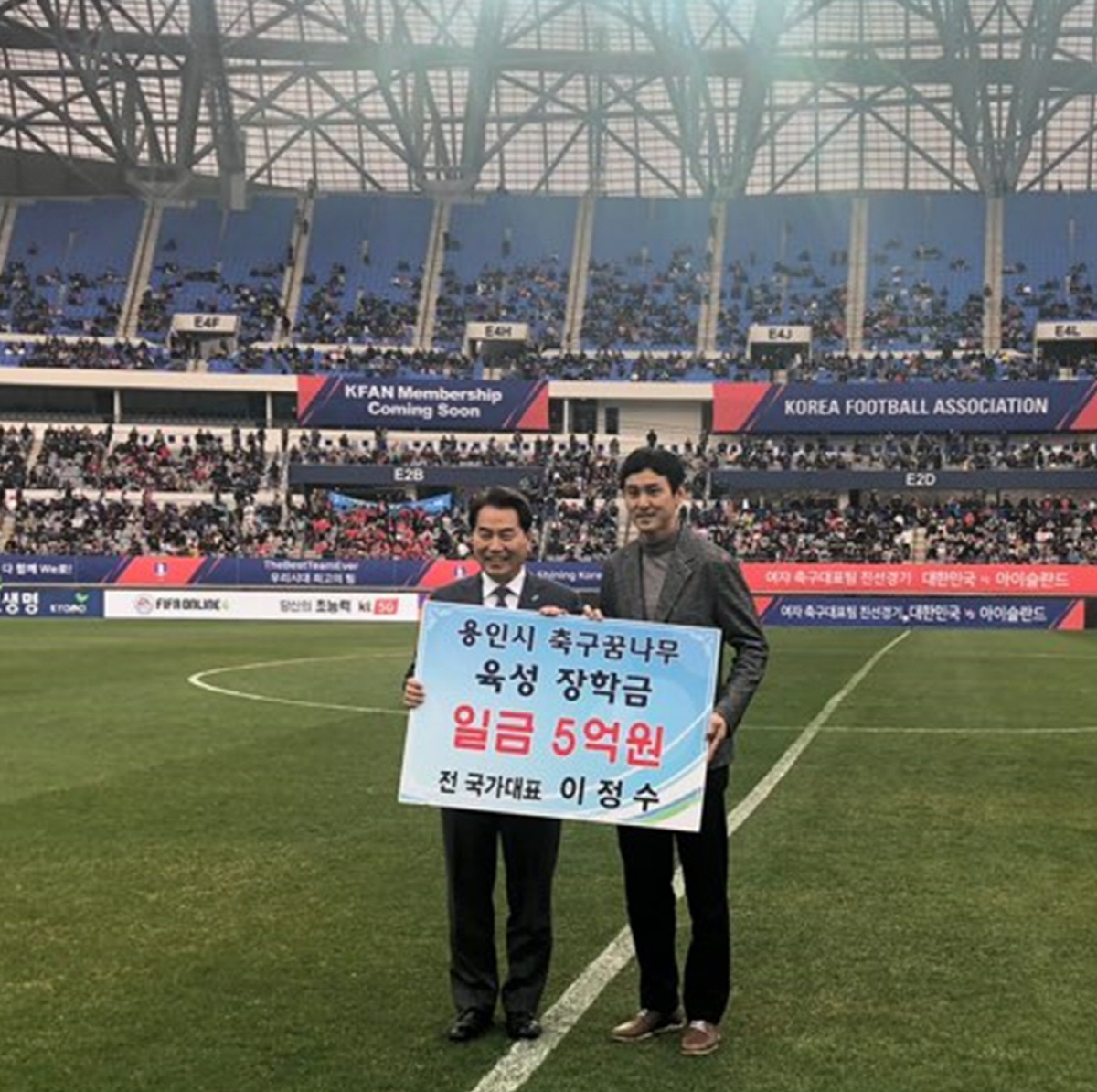 국가대표 수비수 출신 이정수가 '제2의 고향' 용인에서 열린 여자축구 A매치 현장에서 용인 축구 유소년들을 위해 장학금 5억원을 쾌척했다.