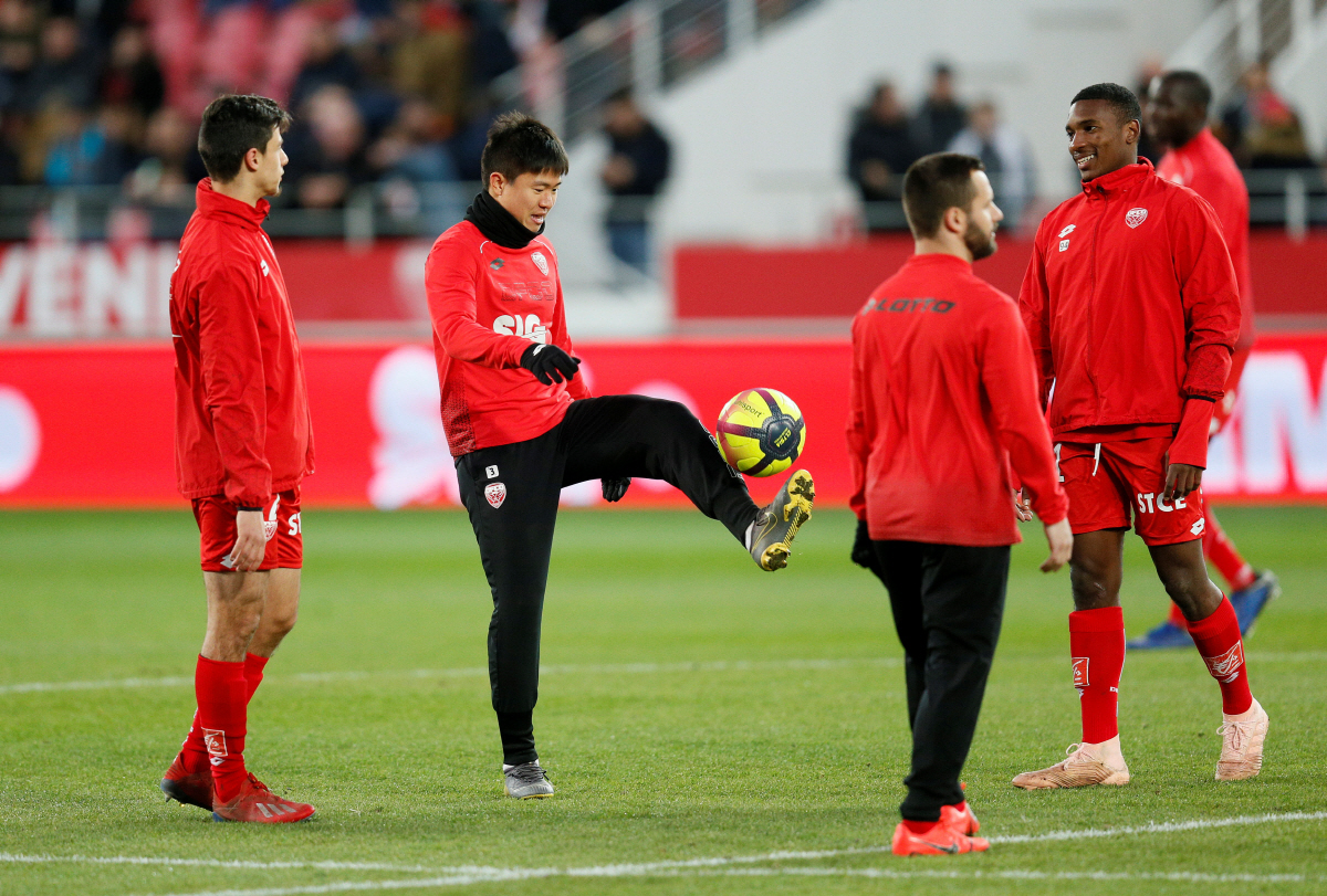 지난 3월 13일 파리 생제르맹과의 경기를 앞두고 디종 동료들과 볼 트래핑을 하며 몸을 풀고 있는 권창훈(가운데)의 모습. 로이터연합뉴스