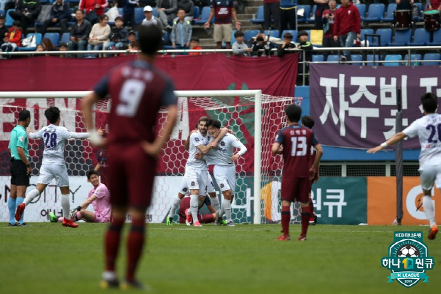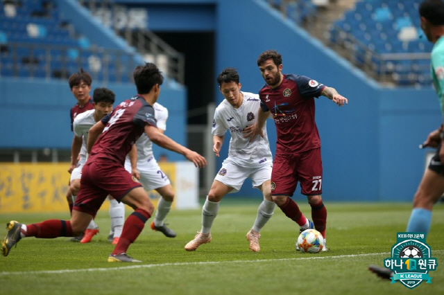 답답하던 0의 흐름은 안양에 의해 깨졌다. 25분께 대전 수비수 이지솔이 자기진영 박스 안으로 공이 흘러가는 가운데, 안양 공격수 조규성을 몸으로 저지하려고 했지만 어이없게 놓쳤다. 조규성은 욕심내지 않고 달려들어오는 미콜라에게 낮은 패스를 연결하며 득점을 이끌었다. 이지솔의 실책성 플레이가 뼈아팠던 장면. 대전은 전반 막바지 박인혁과 키쭈의 연이은 슈팅으로 동점골을 노렸지만, 무위에 그쳤다.