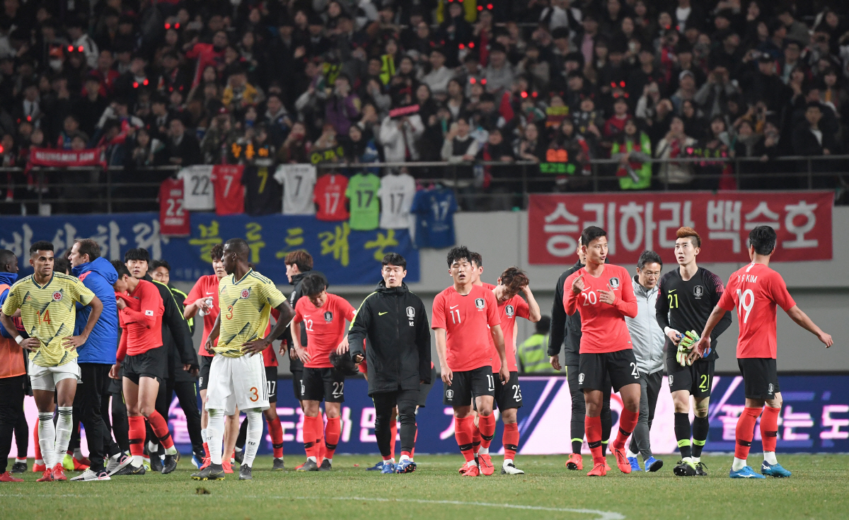 | 벤투 감독이 이끄는 축구국가대표팀이 26일 오후 8시 서울 상암동 서울월드컵경기장에서 콜롬비아와 평가전을 펼쳤다. 축구대표팀이 콜롬비아에 2대1로 승리했다. 경기 종료 후 인사를 나누고 있는 대표팀 선수들. 상암=송정헌 기자 songs@sportschosun.com/2019.03.26/ |