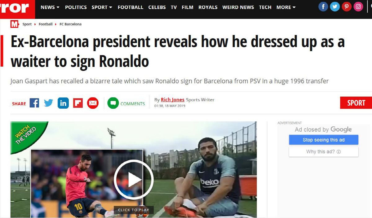 그의 증언에 따르면 에인트호벤이 호나우두를 바르셀로나에 팔기로 해놓고 슬슬 발을 빼기 시작하면서 문제가 생겼다. 아무래도 이적료를 올려받기 위한 협상 전략 때문인 것으로 보인다.