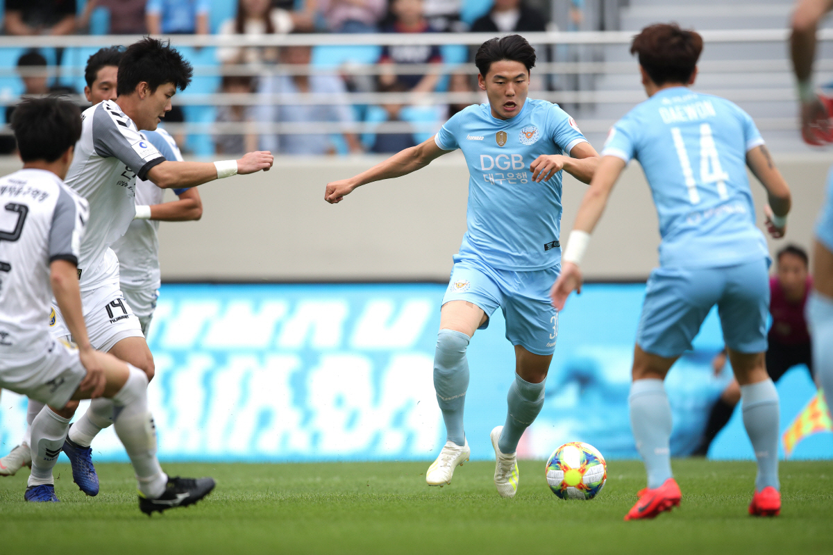 대구FC 포워드 정치인(가운데)이 19일 DGB대구은행파크에서 열린 인천 유나이티드전에 선발 출전해 드리블하고 있다. 사진제공=한국프로축구연맹
