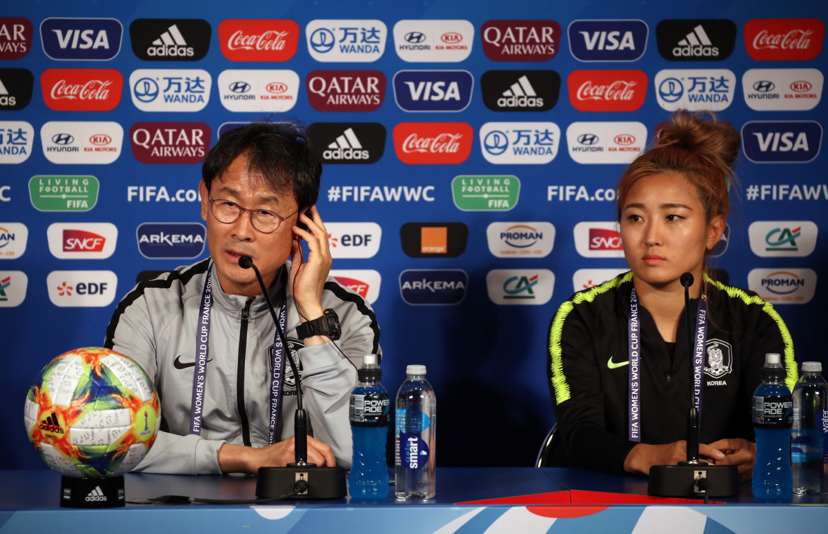 영광스러운 자리다. 선수로서 승리에 대한 강한 열망이 있었다. 지도자로서 두번째 월드컵 하게 됐다. 여전히 월드컵은 선망의 대상이다. 좋은 선수들 덕분에 좋은 자리에서 여러분들을 또 만나게 됐다. 늘 갈망하는 자리고, 늘 염원하는 자리다. [조소현]두번째 월드컵, 너무 기대되고 설렌다. 한국여자축구 A매치 강팀 잡기 어렵다. 이렇게 큰대회에서 강팀과 붙게 되서 기쁘다. 내일 우리가 프랑스를 상대로 경쟁력이 있는 경기를 한다면 많은 강팀들이 우리와 A매치를 뛰고 싶어할 것이다. 이번 경기를 정말 잘하게되면 여자축구선수들, 특히 축구를 좋아하는 여자어린이들이 대표선수 되고 싶은 꿈을 갖도록 할 수 있을 것같다.