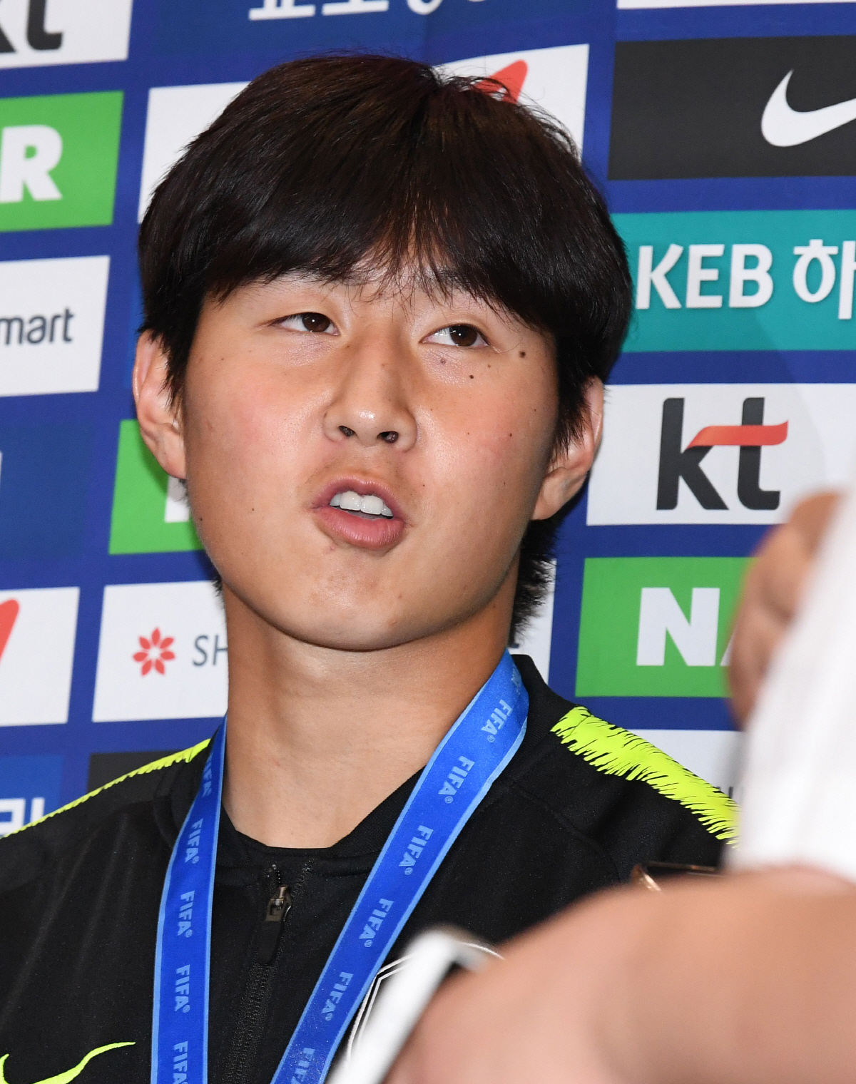 17일 오전 U-20 월드컵 축구국가대표팀 선수단이 인천공항을 통해 금의환향 했다. 기자들의 질문에 답하고 있는 이강인. 인천공항=송정헌 기자 songs@sportschosun.com/2019.06.17/