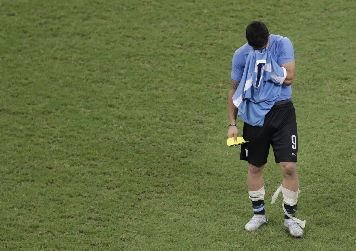 울고 있는 수아레스. (AP Photo/Eraldo Peres) <저작권자(c) 연합뉴스, 무단 전재-재배포 금지>