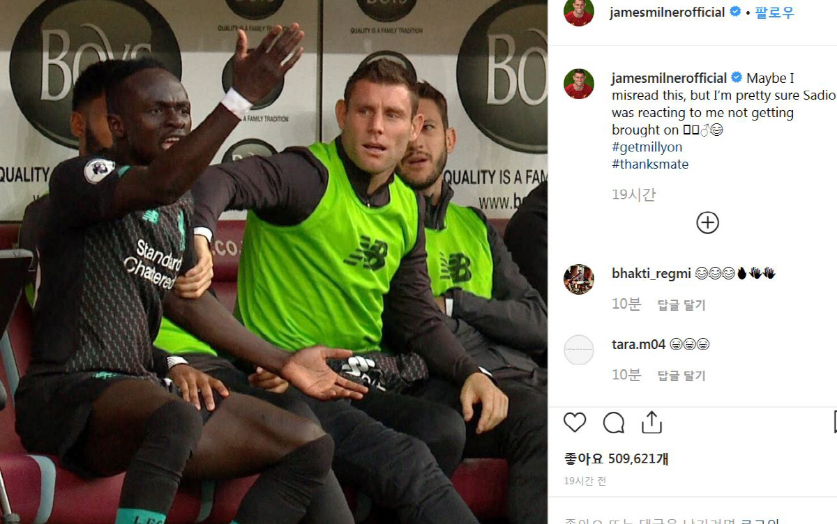 밀너는 2일 개인 SNS(소셜네트워크서비스)에 마네가 호통치는 사진과 함께 '내가 잘못 해석했을 수도 있다. 마네는 내가 투입되지 않아서 화를 낸 것 같다'고 게재했다. 김가을 기자 epi17@sportschosun.com