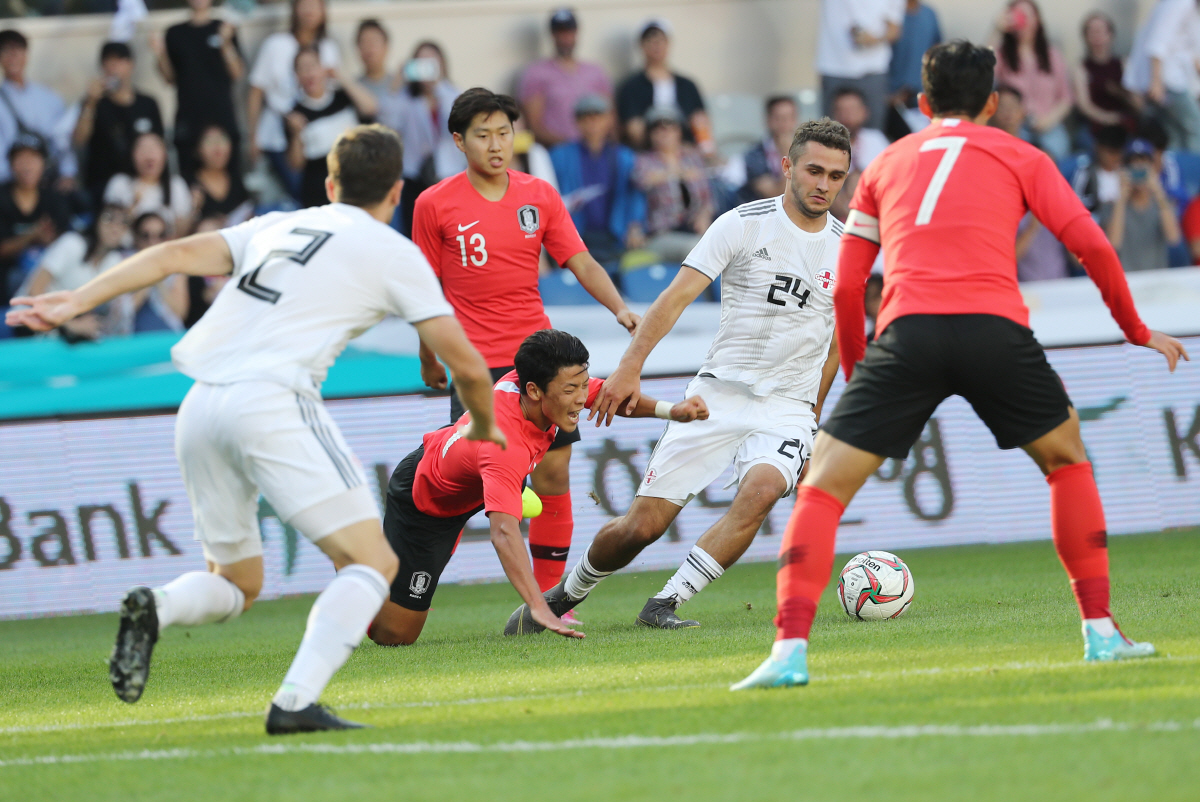스리백을 공격적으로 운영할 때 좌우 윙백의 역할 수행은 매우 중요하다. 공격과 수비시 커버할 영역이 매우 넓다. 활동량은 물론이고, 공수 센스가 좋아야 스리백 전술의 효과를 극대화할 수 있다. 황희찬은 수비 과정에서 위치를 제대로 잡지 못했다. 그러다보니 스리백의 오른쪽 박지수도 어려움을 겪었다. 상대 조지아가 박지수와 황희찬 사이 빈공간을 집중적으로 파고들었고, 그 과정에서 스리백 3명의 간격도 벌어지고 말았다. 조지아는 수비 위주가 나오지 않았다. 강한 압박으로 우리 선수들이 볼키핑을 잘 못하게 만들었다.