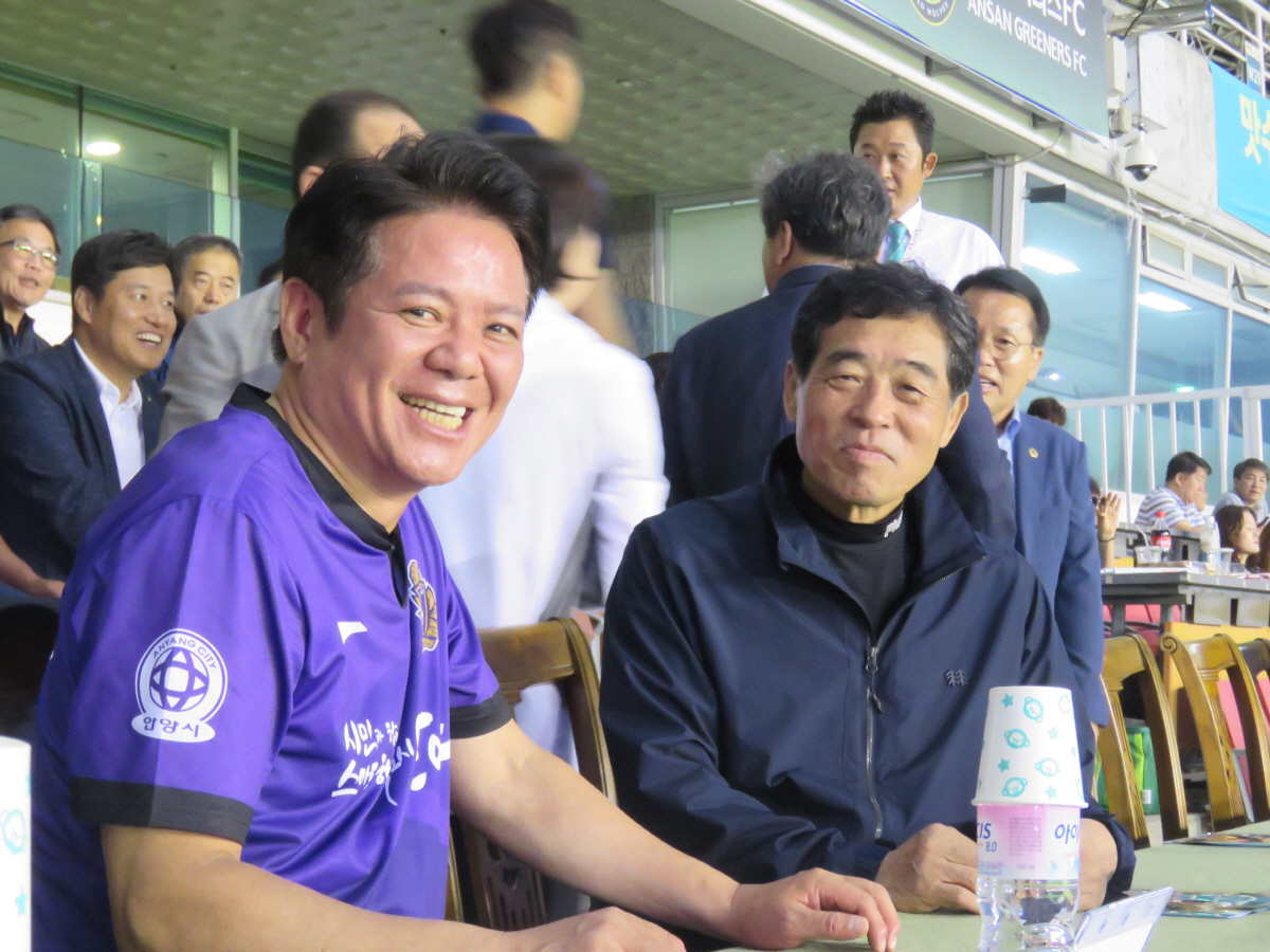 최대호 안양시장(왼쪽)과 윤화섭 안산시장, 양팀의 구단주가 경기전 선전을 다짐하고 있다.