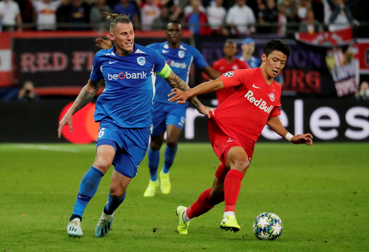 Soccer Football - Champions League - Group E - FC Salzburg v KRC Genk - Red Bull Arena Salzburg, Salzburg, Austria - September 17, 2019 RB Salzburg's Hwang Hee-chan in action with KRC Genk's Sebastien Dewaest REUTERS/Leonhard Foeger