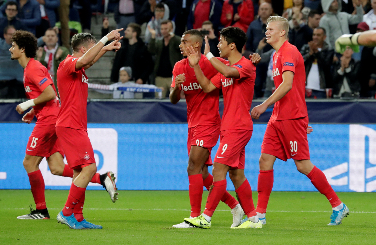 Soccer Football - Champions League - Group E - FC Salzburg v KRC Genk - Red Bull Arena Salzburg, Salzburg, Austria - September 17, 2019 RB Salzburg's Hwang Hee-chan celebrates scoring their third goal REUTERS/Leonhard Foeger