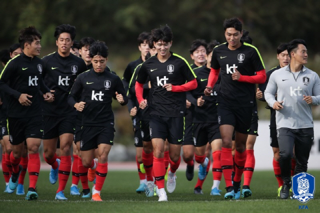 그렇다고 마냥 들뜬 분위기는 아니다. '공과 사' 구분은 명확하다. 이날도 마찬가지였다. 김학범호는 40여분 간 스트레칭을 한 뒤 전술훈련에 돌입했다. 선수들 얼굴에는 묘한 긴장감이 흘렀다.