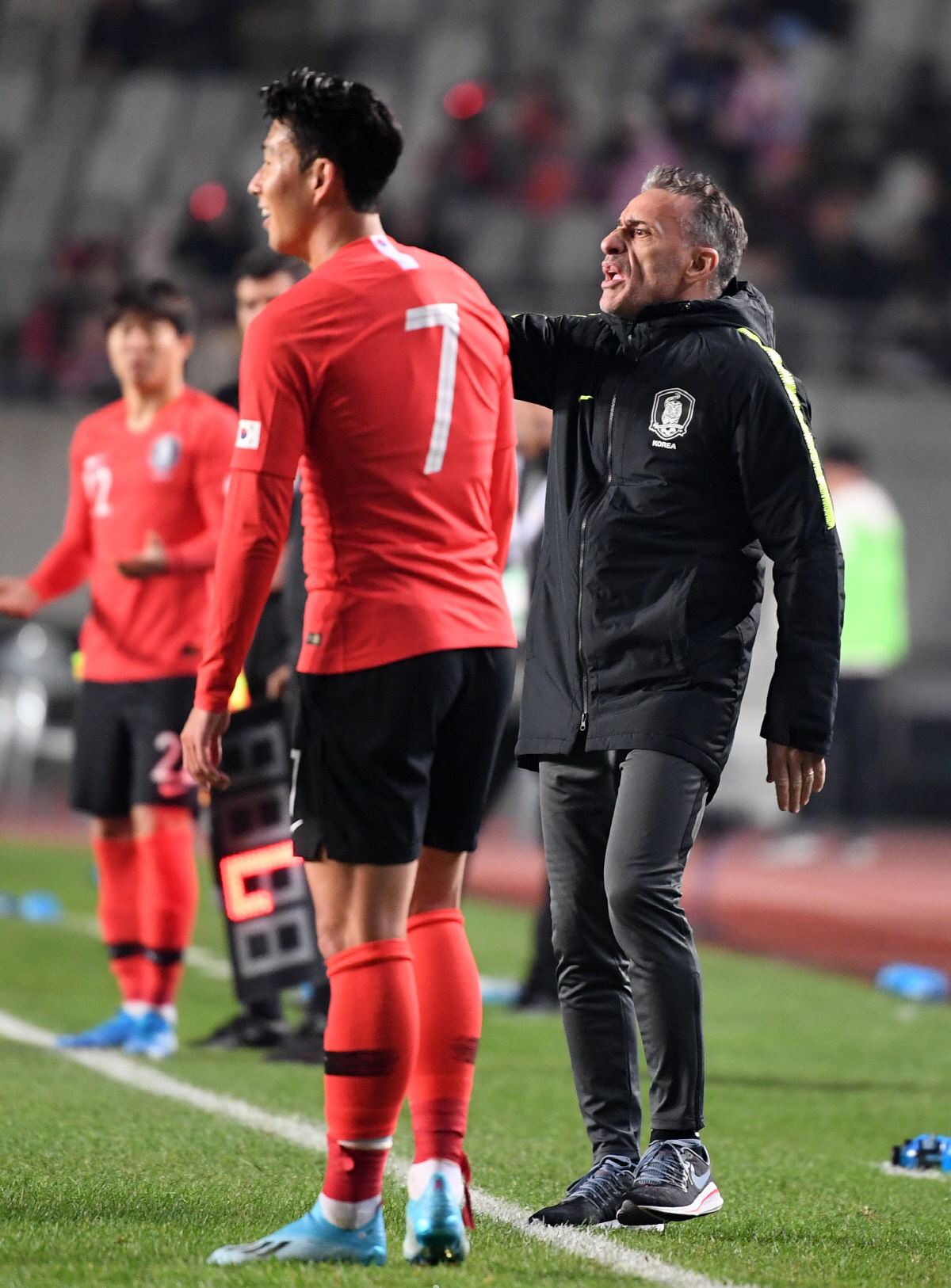 한국과 스리랑카의 2022 카타르 월드컵 아시아 지역 2차 예선 경기가 10일 화성종합경기타운 주경기장에서 열렸다. 후반, 손흥민이 교체아웃되며 경고를 받자 벤투 감독이 항의하고 있다. 화성=허상욱 기자 wook@sportschosun.com/2019.10.10/
