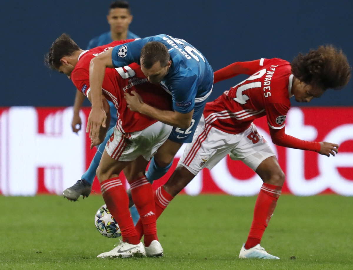 Zenit's Artem Dzyuba, center, fights for the ball with Benfica's Ruben Dias, left, and Benfica's Tomas Tavares during the Champions League group G soccer match between Zenit St.Petersburg and Benfica at the Saint Petersburg stadium in St.Petersburg, Russia, Wednesday, Oct. 2, 2019. (AP Photo/Mike Kireev) <저작권자(c) 연합뉴스, 무단 전재-재배포 금지>