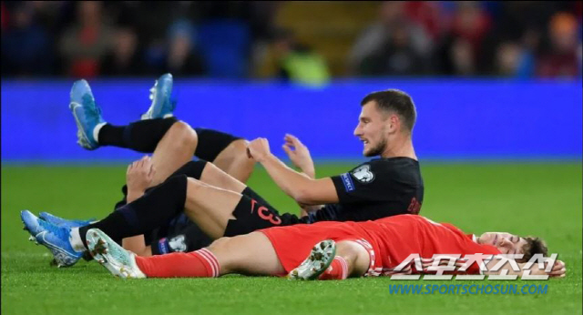 ◇웨일즈 대표팀 다니엘 제임스(오른쪽)이 14일 새벽(한국시각) 열린 유로2020 예선 조별리그에서 크로아티아와 경기도중 상대 수비수 도마고이 비다와 충돌해 그라운드에 누워 있다. 사진=더선 홈페이지 캡쳐