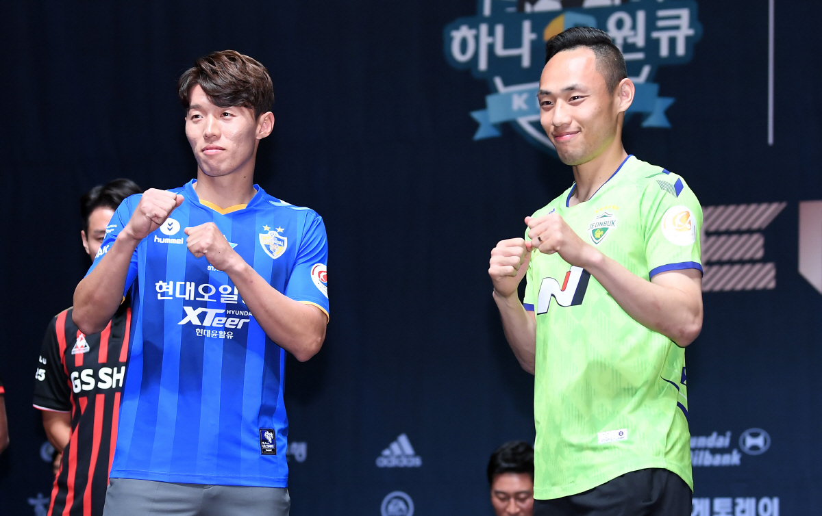 | K리그1 2019 파이널라운드 미디어데이가 16일 오후 서울 서대문구 신촌동 연세대학교 백주년기념관에서 열렸다. 울산 김보경, 전북 문선민이 포토타임을 갖고 있다. 신촌동=박재만 기자 pjm@sportschosun.com /2019.10.16/ |