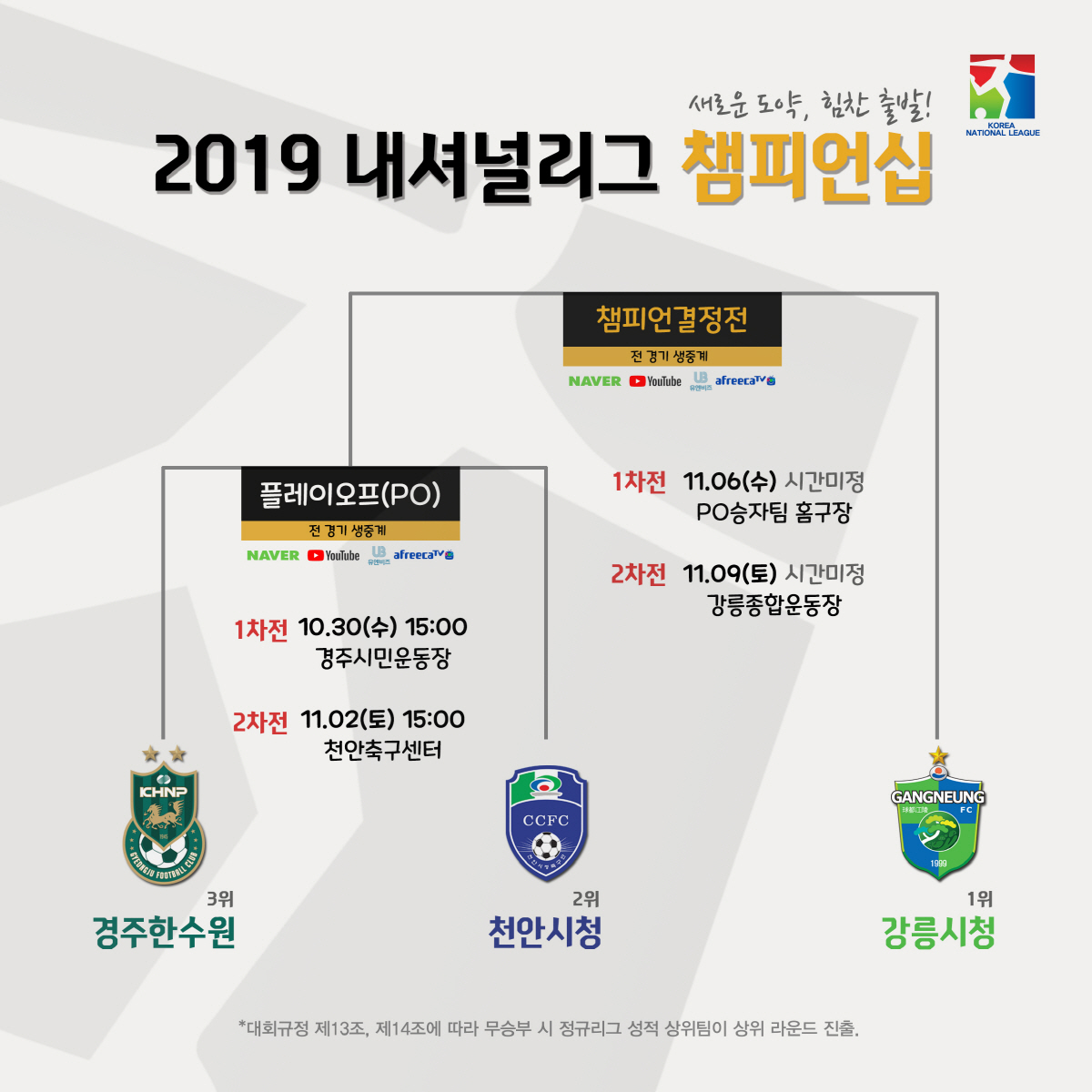 정규리그 3위로 턱걸이한 경주한수원은 30일 오후 3시 경주시민운동장에서 열린 '2위' 천안시청과의 2019년 내셔널리그 플레이오프(PO) 1차전에서 2대0으로 이겼다. 1차전에서 완승을 거둔 경주한수원은 2차전에서 0대1로 패해도 챔피언결정전에 진출할 수 있다. 내셔널리그 포스트시즌은 1, 2차전을 치러 승점, 골득실로 승부를 가리고, 동률일 경우, 정규리그 상위팀에게 어드밴티지를 준다.
