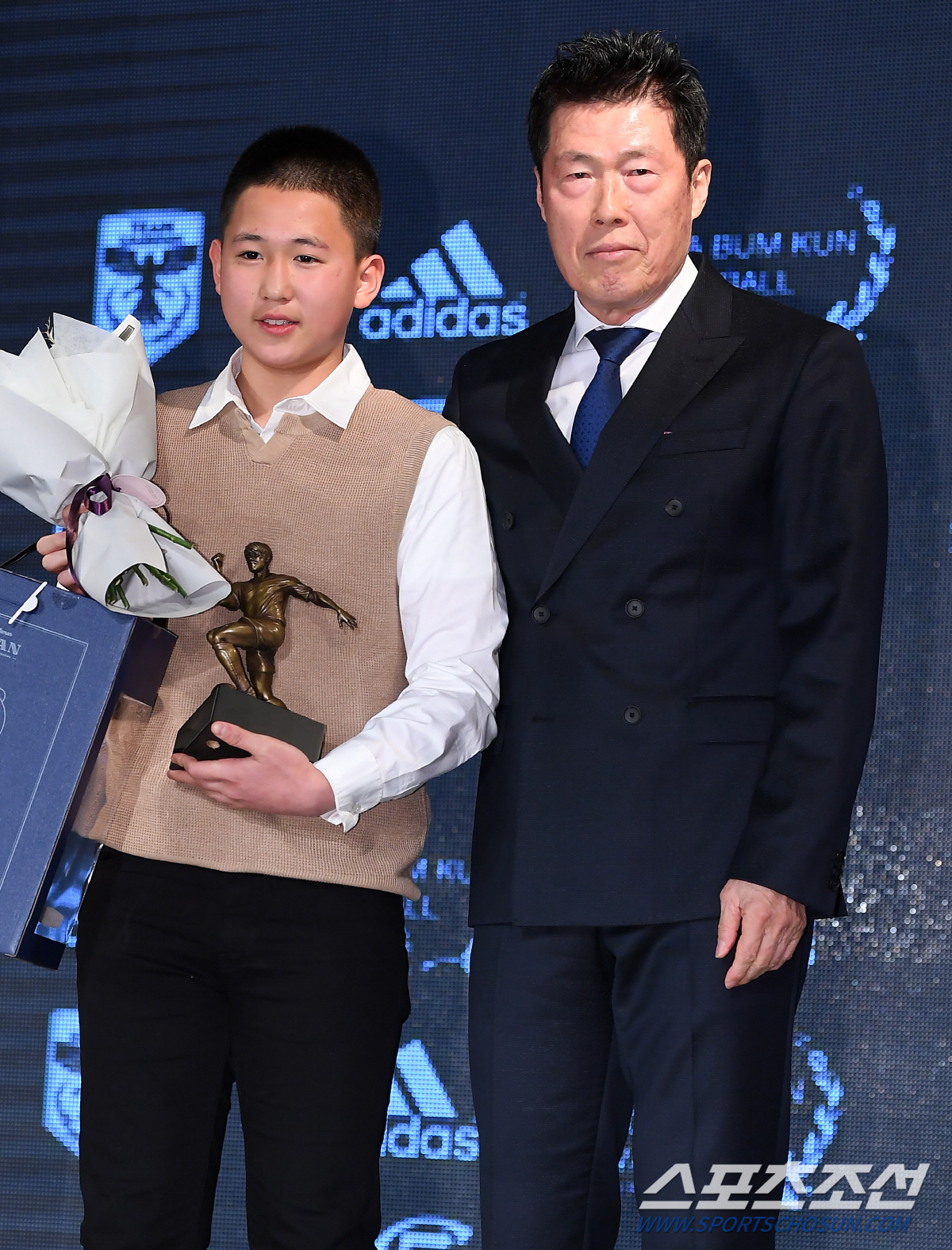 제32회 차범근 축구상 시상식이 6일 서울 종로구 부암동 AW컨벤션센터에서 열렸다. 차범근 이사장과 상을 수상한 고필관이 기념촬영을 하고 있다. 부암동=박재만 기자 pjm@sportschosun.com/2020.02.06/
