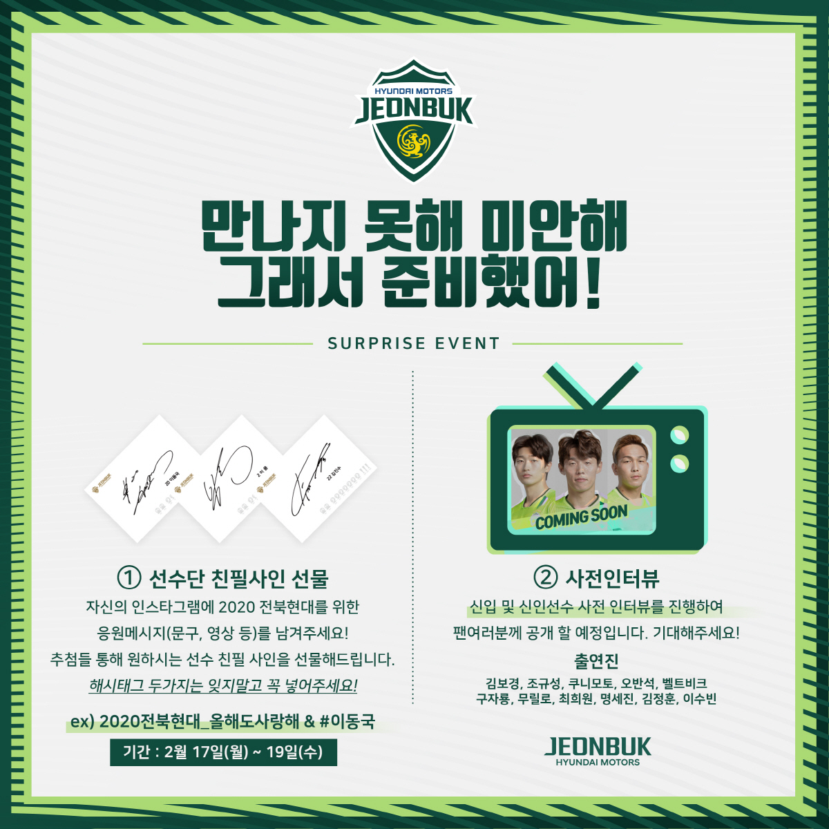 전북 선수들의 친필 사인을 받고 싶은 팬은 자신의 인스타그램에 올 시즌 전북현대를 응원하는 메시지와 함께 사인을 원하는 선수와 구단에서 지정한 해시태그를 달면 된다. 응원은 메시지, 사진, 영상 등 자유로운 방법으로 하면 된다. 이벤트 참여에 대한 상세 내용은 구단 SNS를 통해 확인할 수 있다. 또 전북은 새 시즌 팬들의 기대를 한몸에 받고 있는 스타플레이어 김보경, 쿠니모토, 조규성 등 신입 선수들의 영상 인터뷰를 제작해 팬들에게 공개할 예정이다. 전북 구단은 "추후 코로나 바이러스 사태가 안정화되면 팬들과의 스킨십 활등을 더 적극적으로 해나갈 계획"이라고 밝혔다.