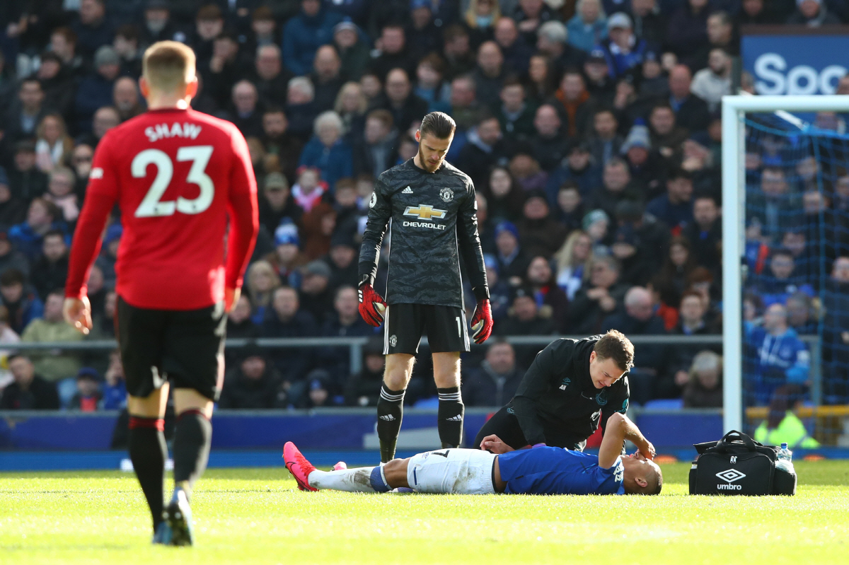 LIVERPOOL, ENGLAND - MARCH 01: Richarlison of Everton receives treatment during the Premier League match between Everton FC and Manchester United at Goodison Park on March 01, 2020 in Liverpool, United Kingdom. (Photo by Clive Brunskill/Getty Images)