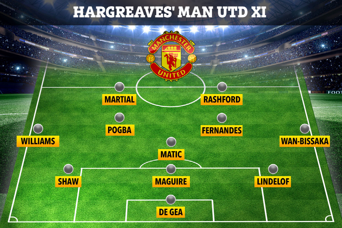 앤써니 마시알-마커스 래시포드 투톱에 페르난데스-폴 포그바를 밑에 세웠다. 하그리브즈는 "페르난데스와 포그바, 래시포드-마시알을 함께 기용하면 공격적으로 좋아질 수 있다"고 했다. 이 두 미드필더를 뒷받침할 파트너로는 놀랍게도 맥토미니, 프레드도 아닌 네마냐 마티치를 찍었다. 하그리브즈는 "박스 투 박스 유형보다는 뒤에서 버텨줄 선수가 낫다. 마티치가 이 팀의 중심을 잡아줄 것"이라고 했다.
