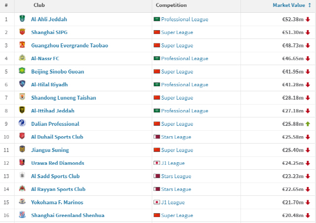 아시아 클럽 중 시장 가치 1위는 사우디아라비아 알 아흘리로 5238만유로(약 698억원)로 평가됐다. 2위는 중국 상하이 상강(5130만유로), 3위는 중국 광저우 헝다(4873만유로), 4위는 사우디 알 나스르(4665만유로), 5위는 베이징 궈안(4195만유로)이었다.