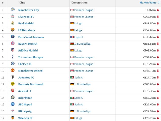 세계 축구클럽 중에선 EPL 맨시티가 10억200만유로(약 1조3346억원)로 최고 시장 가치를 보였다. 그 다음은 리버풀(9억6695만유로) 레알 마드리드(8억8850만유로) FC바르셀로나(8억5265만유로) 파리생제르맹(8억4365만유로) 순이었다.