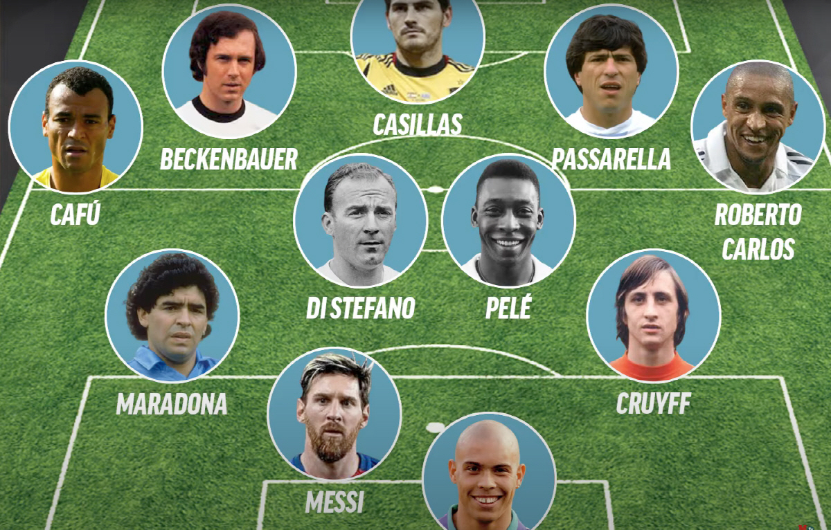 투톱은 '메나우두'다. 아르헨티나와 바르셀로나의 '리빙 레전드' 리오넬 메시와 브라질 전설 호나우두가 최전방 공격을 담당한다. 양 측면 공격은 아르헨티나의 축구신 디에고 마라도나와 네덜란드의 예술가 요한 크루이프가 맡는다. '말디니'는 중앙 미드필더 듀오를 공격수로 채웠다. 레알 마드리드 최고의 선수 중 하나로 꼽히는 알프레도 디 스테파노와 축구황제 펠레가 중원을 담당한다. 이 팀을 상대하는 수비수들은 경기시작 1분만에 은퇴를 진지하게 고민할 수도 있다. 호베르투 카를루스, 다니엘 파사렐라, 프란츠 베켄바워, 카푸가 포백을 구성한다. 이 팀의 골키퍼는 스페인 출신 이케르 카시야스.