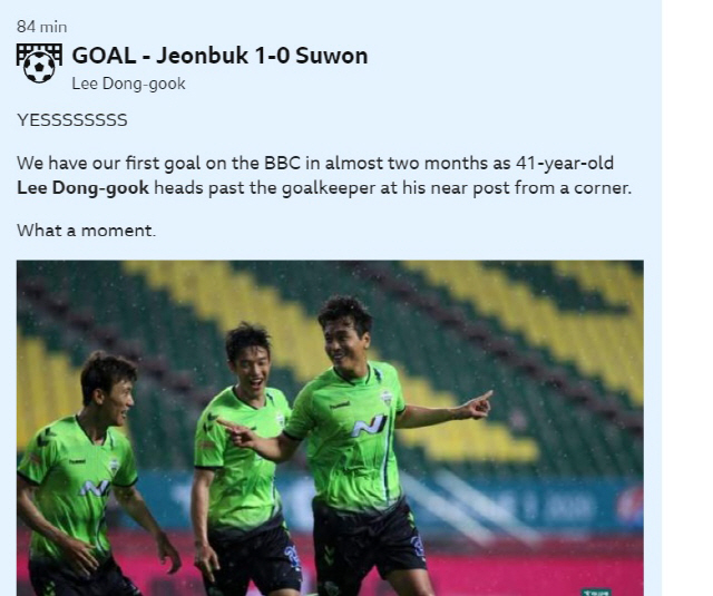 [이건 스포츠조선닷컴 기자]BBC가 올 시즌 K리그 첫 골을 기록한 이동국(41, 전북)을 주목했다.