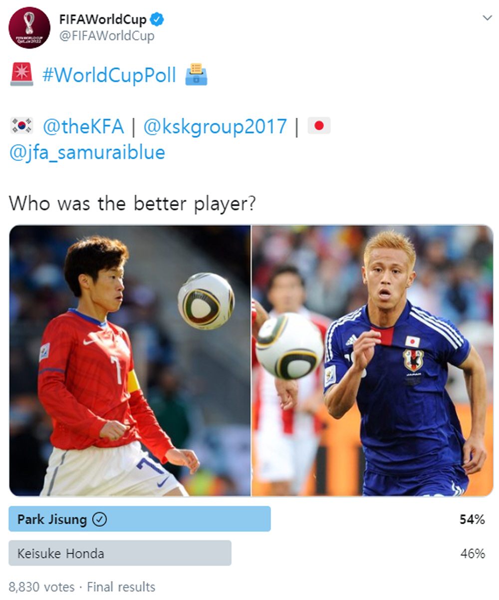 아이디 'simon'은 '비교할 가치조차 없다. 시간낭비다. 혼다가 월드컵에서 좋은 모습을 보인 건 맞지만, 박지성은 한일월드컵에서 준결승을 밟았다. 클럽 성과는…얘기 안 할란다'라고 적었다. 그는 '만약 혼다가 박지성보다 나은 선수라면 유럽의 빅클럽에 스카웃됐어야 한다'고 덧붙였다.