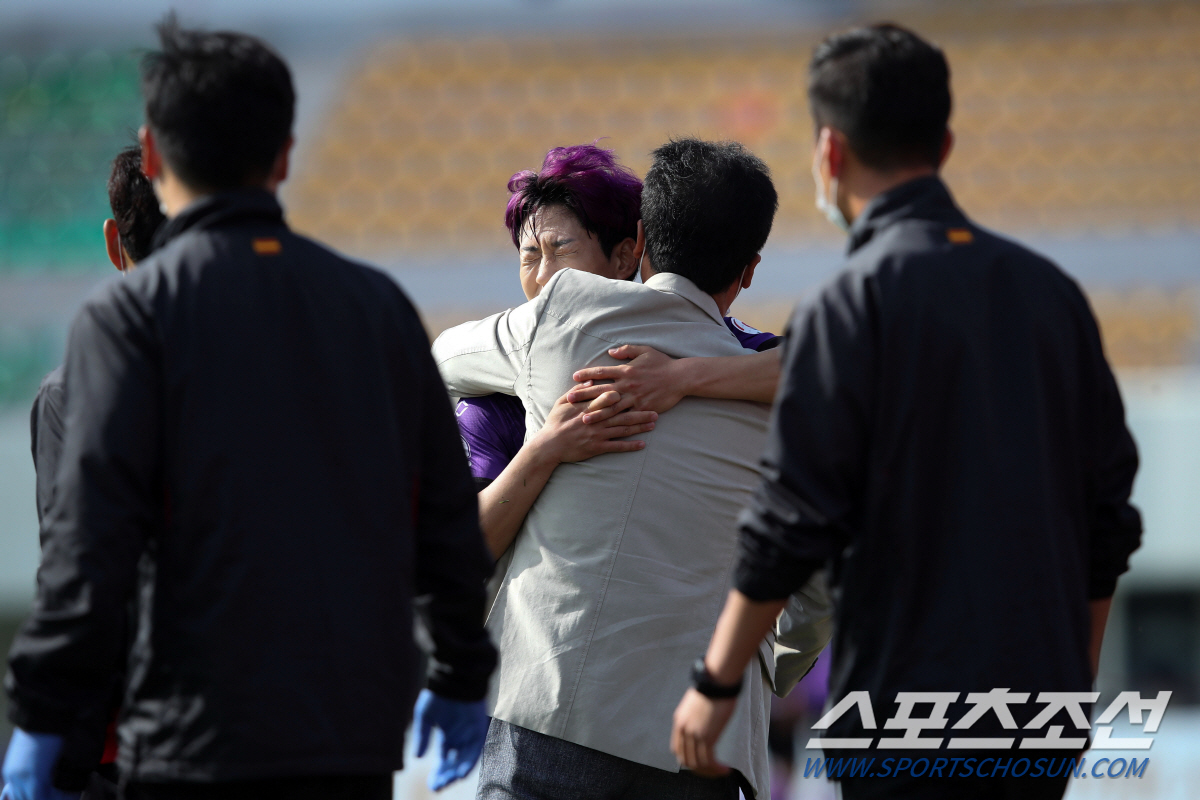 이정빈은 벤치로 달려들어 그대로 김형열 감독과 포옹을 했다. 안양의 상징색깔 보라색 염색머리가 햇볕에 유난히 빛났다. 이날 경기가 끝난 뒤 이정빈은 삭발식을 할 예정이다. 다행히 일부러 검은색 염색은 할 일이 없다.