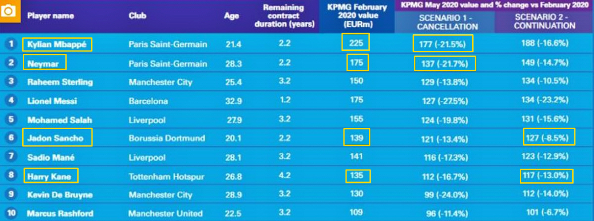 네이마르 역시 지난 2월 추정 몸값 1억7500만 유로(약 2382억7000만 원)에서 1억3700만 유로(약 1865억 원)로 21.7%가 줄었다. 반면 맨유 등이 눈독 들이는 '도르트문트 신성' 제이든 산초는 1억3900만 유로(약 1892억 5000만 원)에서 1억2700만 유로(약 1729억 원)로 8.5%, 한자릿대 감소율을 보였다. 성장을 위해 토트넘을 떠날 수 있다고 공언한 '손흥민 동료' 해리 케인의 몸값은 1억3500만 유로(약 1838억 원)에서 1억1700만 유로(약 1593억 원)로 13% 감소했다.