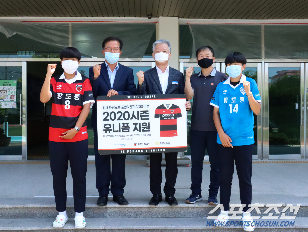 포항은 2013년부터 포항시내 각급 유일의 여자축구부인 3개 팀에 훈련용 생수를 지원해왔으며, 작년부터는 유니폼-트레이닝복 세트 등 용품 지원도 함께하며 지역 여자축구 발전을 적극 후원하고 있다. 전영지 기자 sky4us@sportschosun.com