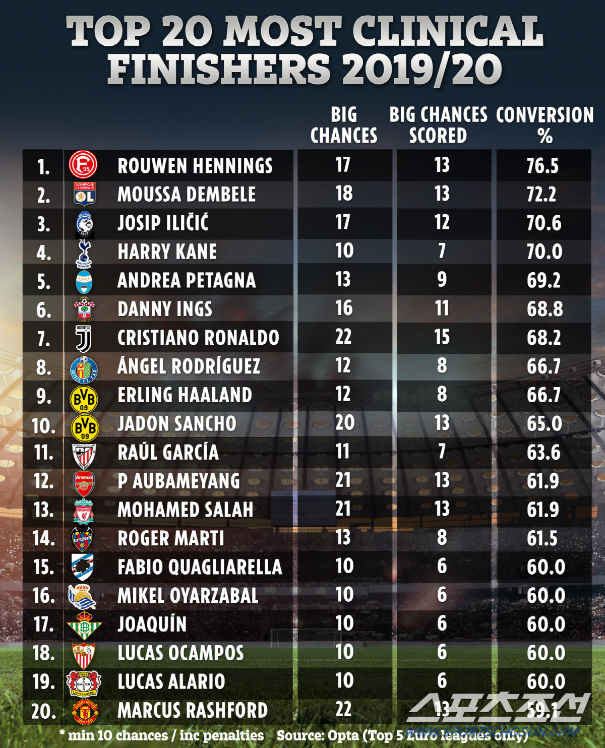 영국 대중지 더 선은 9일(한국시각) 올 시즌 유럽 5대리그를 대상으로 한 스트라이커 중 최고의 골 결정력을 지닌 선수 톱 20을 선정했다. 자료는 세이버 매트릭스 통계사이트 'Opta'를 참조했다.