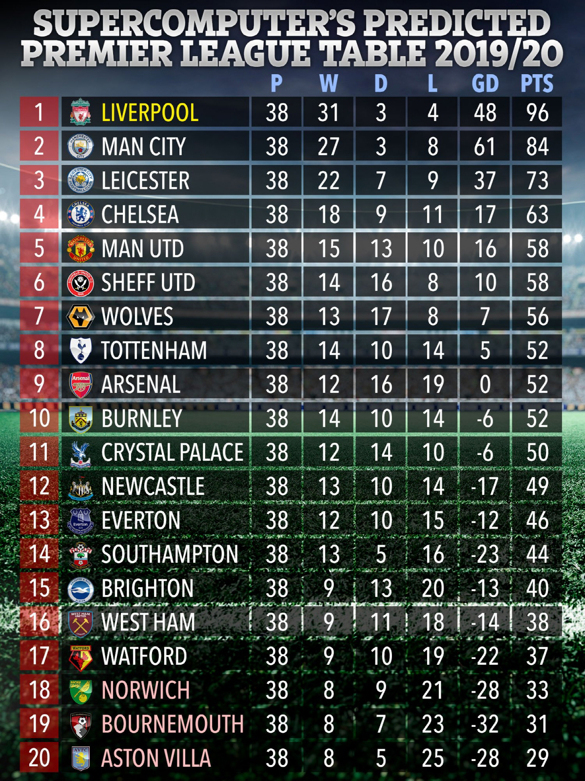 일단 리버풀을 제외하고, 2위부터 맨시티, 레스터시티, 첼시 순이었다. 맨유는 셰필드를 골득실로 제치고 5위에 올랐다. 맨시티의 징계 여부에 따라 유럽챔피언스리그 진출도 가능했다. 토트넘과 아스널은 나란히 8, 9위에 머물렀다. 강등권은 노리치, 본머스, 애스턴빌라의 몫이었다. 왓포드가 살아난다고 슈퍼컴퓨터는 예측했다.