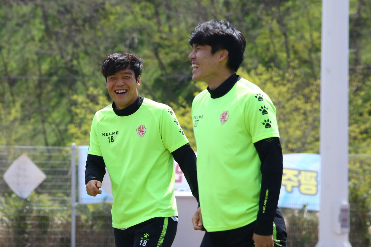 [스포츠조선 윤진만 기자]지난달 아찔한 부상을 했던 김효기(33·광주FC)가 건강한 모습으로 훈련장에 돌아왔다.
