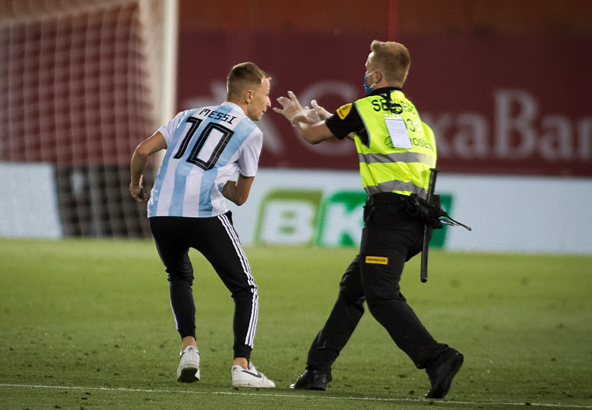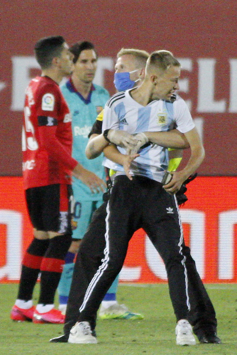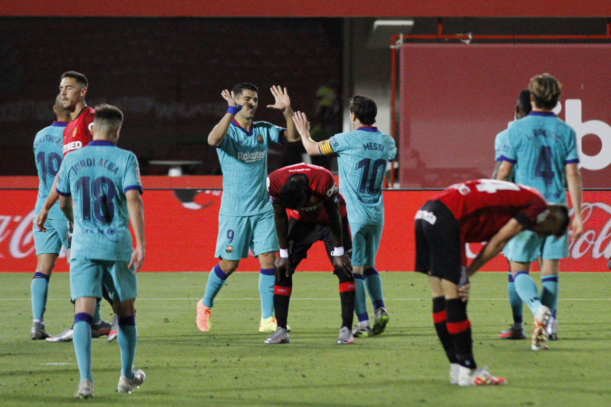 Barcelona's Lionel Messi, center right, celebrates with his teammates after scoring his side's fourth goal during the Spanish La Liga soccer match between Mallorca and FC Barcelona at Son Moix Stadium in Palma de Mallorca, Spain, Saturday, June 13, 2020. With virtual crowds, daily matches and lots of testing for the coronavirus, soccer is coming back to Spain. The Spanish league resumes this week more than three months after it was suspended because of the COVID-19 pandemic. (AP Photo/Francisco Ubilla)