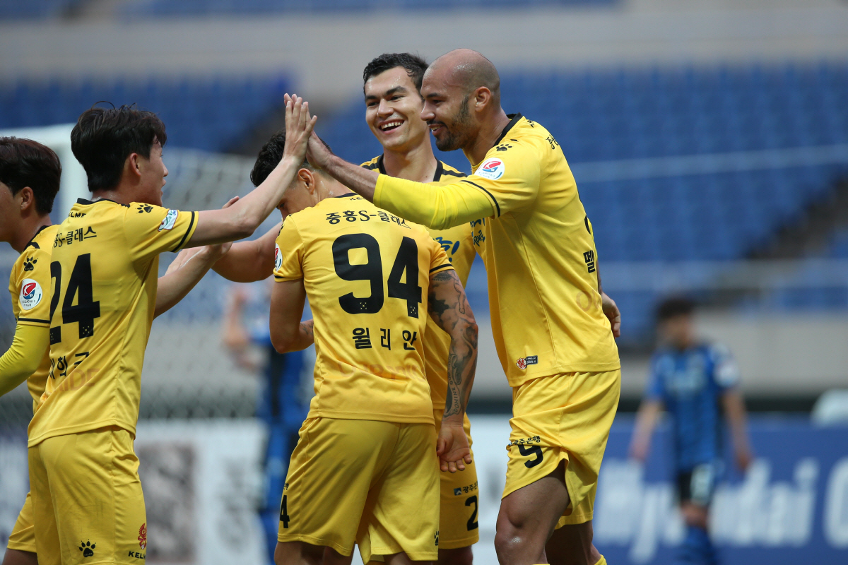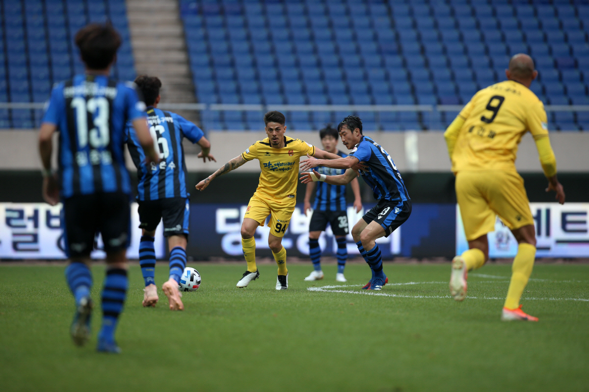 하지만 선제골은 광주쪽에서 나왔다. 28분 코너킥 상황. 이으뜸이 왼발로 올려준 공을 펠리페가 니어 포스트에서 '잘라 먹었다'. 인천 수비진들은 속수무책으로 당했다. 39분 무고사의 감각적인 오른발 프리킥이 광주 골키퍼 이진형에게 막히면서 전반은 광주가 1골 앞선 채 끝났다.