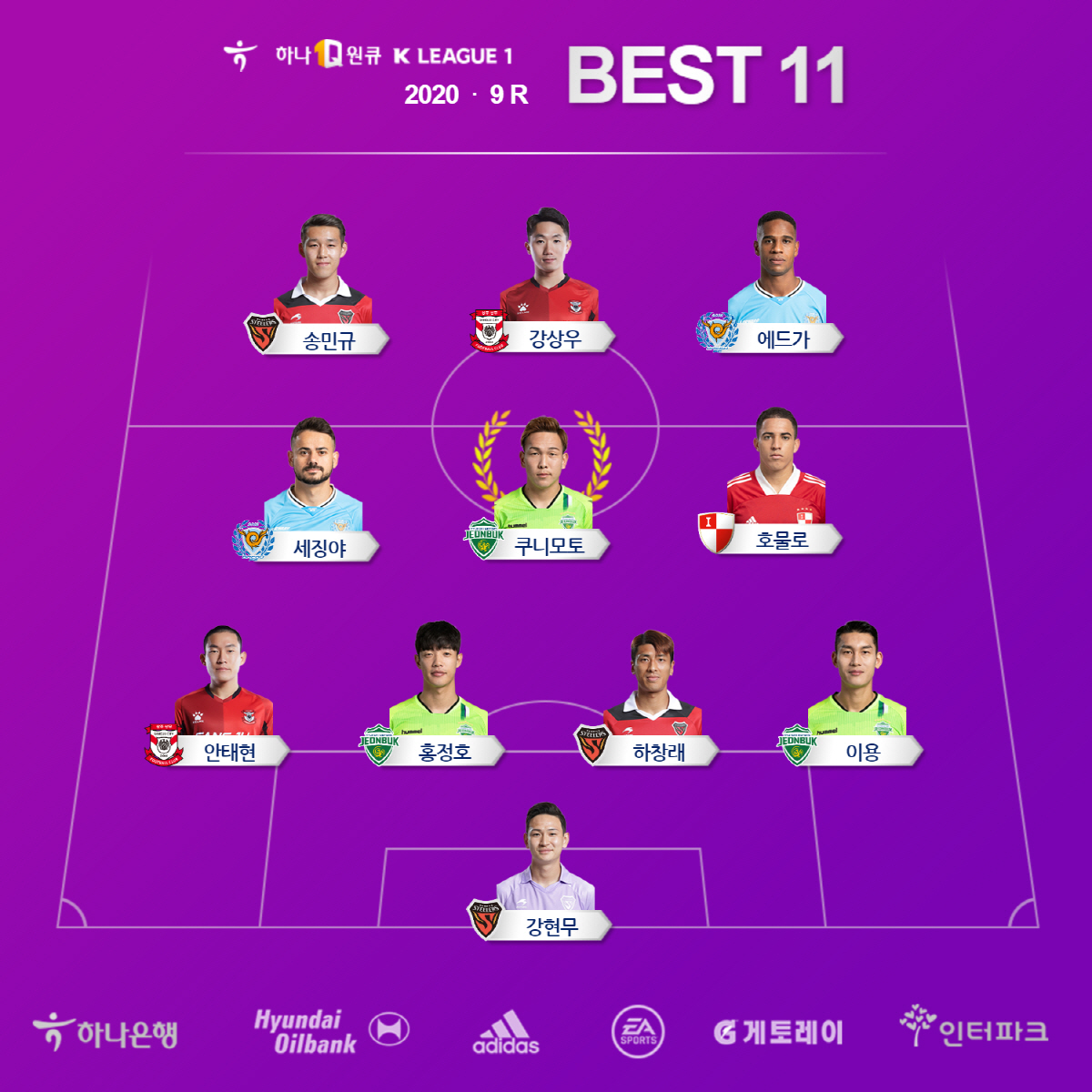 1·2위 팀간 대결로 화제를 모았던 울산-전북전서 쐐기골을 터트린 일본 출신 쿠니모토(전북)가 9라운드 MVP로 선정됐다. 당시 쿠니모토는 1-0으로 앞선 후반 종료 직전 쿠니모토가 울산 수비진을 제친 후 왼발로 감아차 울산 골망을 흔들었다. K리그2 8라운드 MVP는 서울 이랜드 외국인 공격수 레안드로였다. 레안드로는 부천FC과의 원정 경기서 2골 1도움을 올리며 이랜드의 3대2 역전승을 이끌었다.