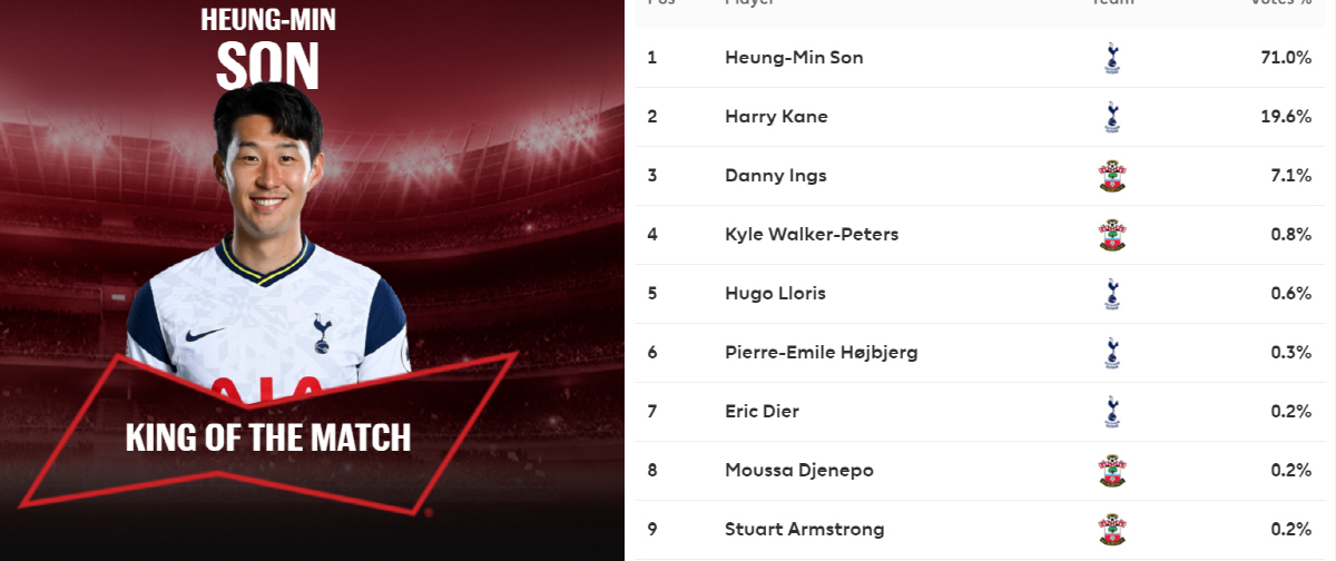 [스포츠조선 노주환 기자]토트넘 손흥민이 경기 MOM에 뽑혔다. EPL 홈페이지가 팬투표로 실시한 토트넘-사우스햄턴전 '킹 오브 더 매치'에 손흥민이 선정됐다.