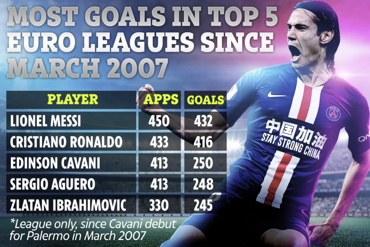 7일 영국 매체 '더선'은 에딘손 카바니가 '2007년 3월 이후 유럽 5대리그에서 메시, 호날두 다음으로 가장 많은 골을 넣은 선수다'고 보도했다. 더선의 자료에 따르면 카바니는 팔레르모 시절 부터 지금까지 리그에서 413경기에 출전해 250골을 넣었다. 이는 1위 메시의 450경기 432골, 2위 호날두의 433경기 250골 바로 아래 위치하는 기록이다. 카바니 다음으로 세르히오 아게로가 413경기에서 248골을 터트리며 4위를 차지했다. 5위는 즐라탄 이브라히모비치로 330경기에서 245골을 넣었다.