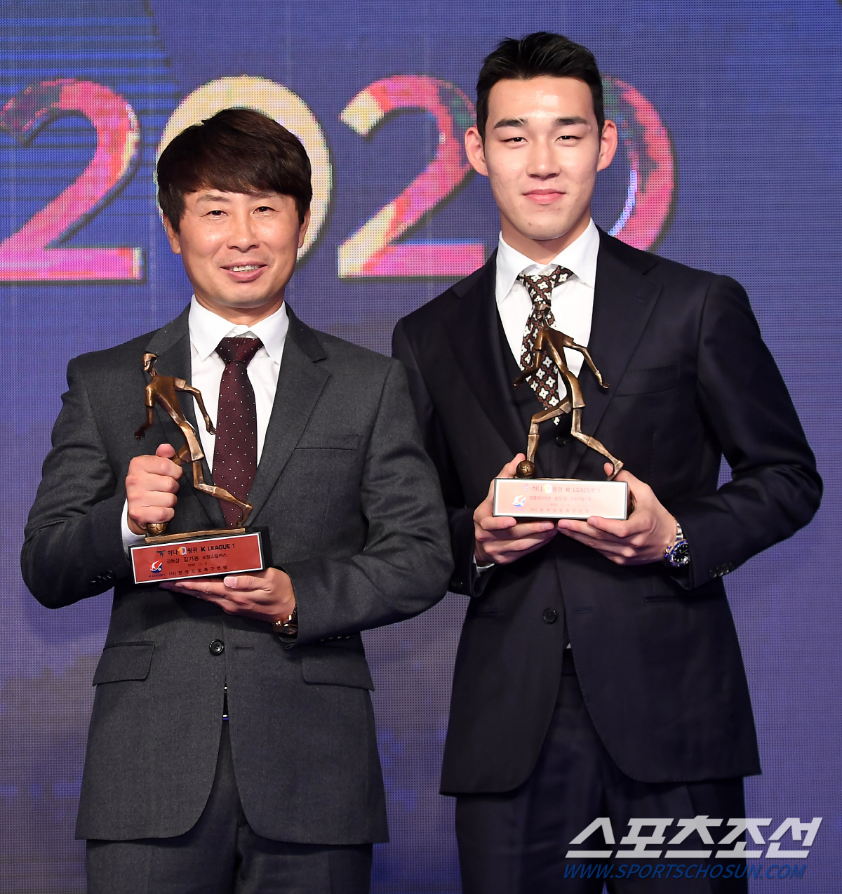 2020 K리그 대상 시상식이 5일 서울 서대문구 홍은동 스위스그랜드호텔에서 열렸다. 감독상을 수상한 김기동 감독과 영플레이어상 송민규가 포토타임을 갖고 있다. 홍은동=박재만 기자 pjm@sportschosun.com/2020.11.05/