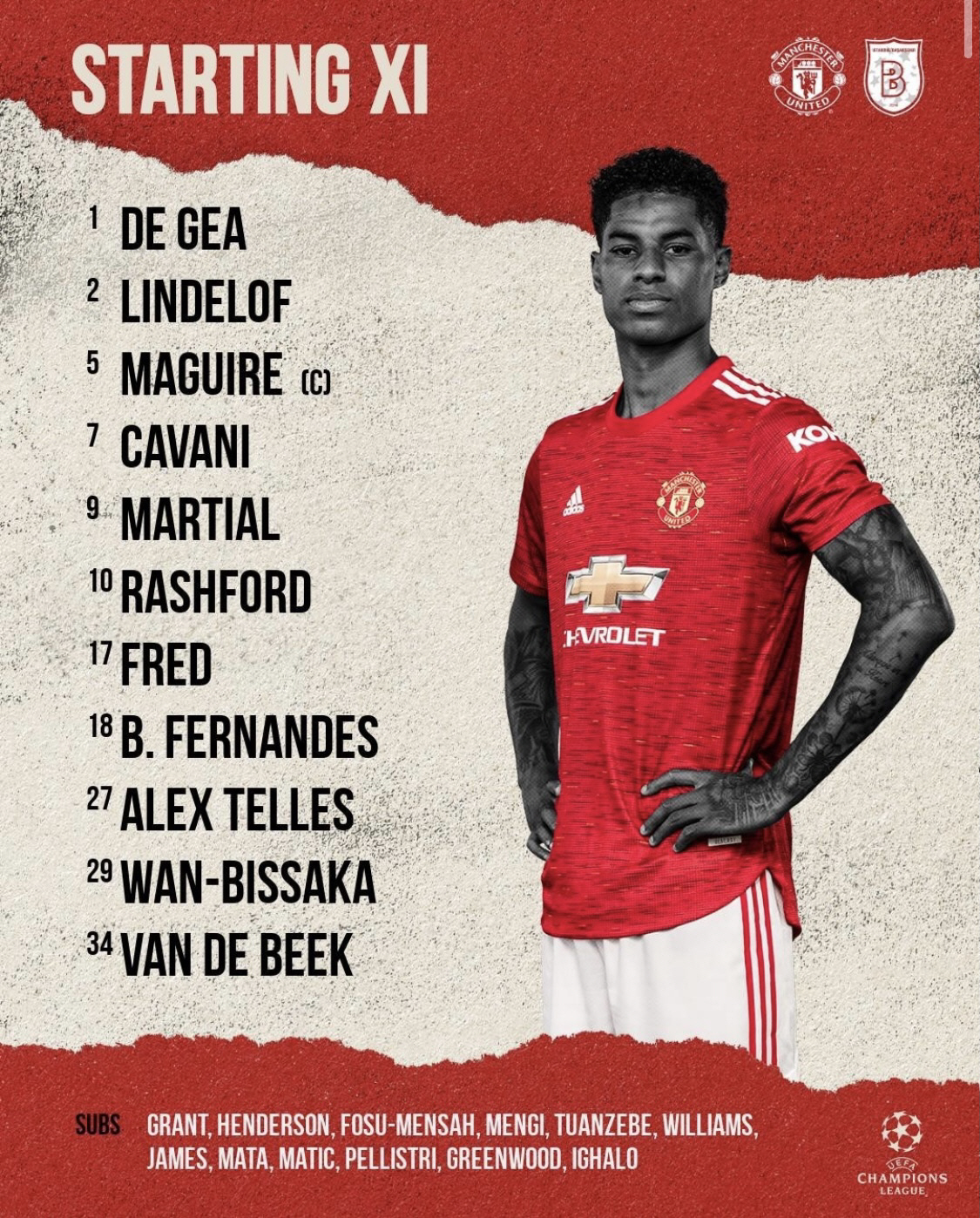 교체명단에는 딘 핸더슨, 포수-멘사, 튀앙제브, 다니엘 제임스, 후안 마타, 네마냐 마티치, 메이슨 그린우드, 오디온 이갈로 등이 이름을 올렸다.